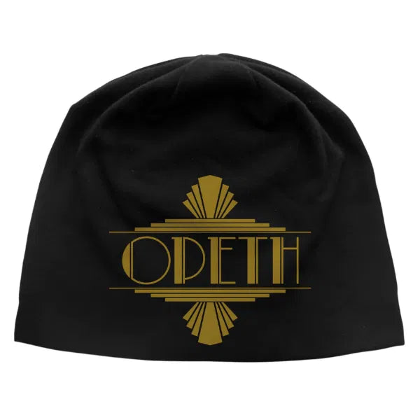 Official Opeth merchandise, black jersey beanie with a printed design